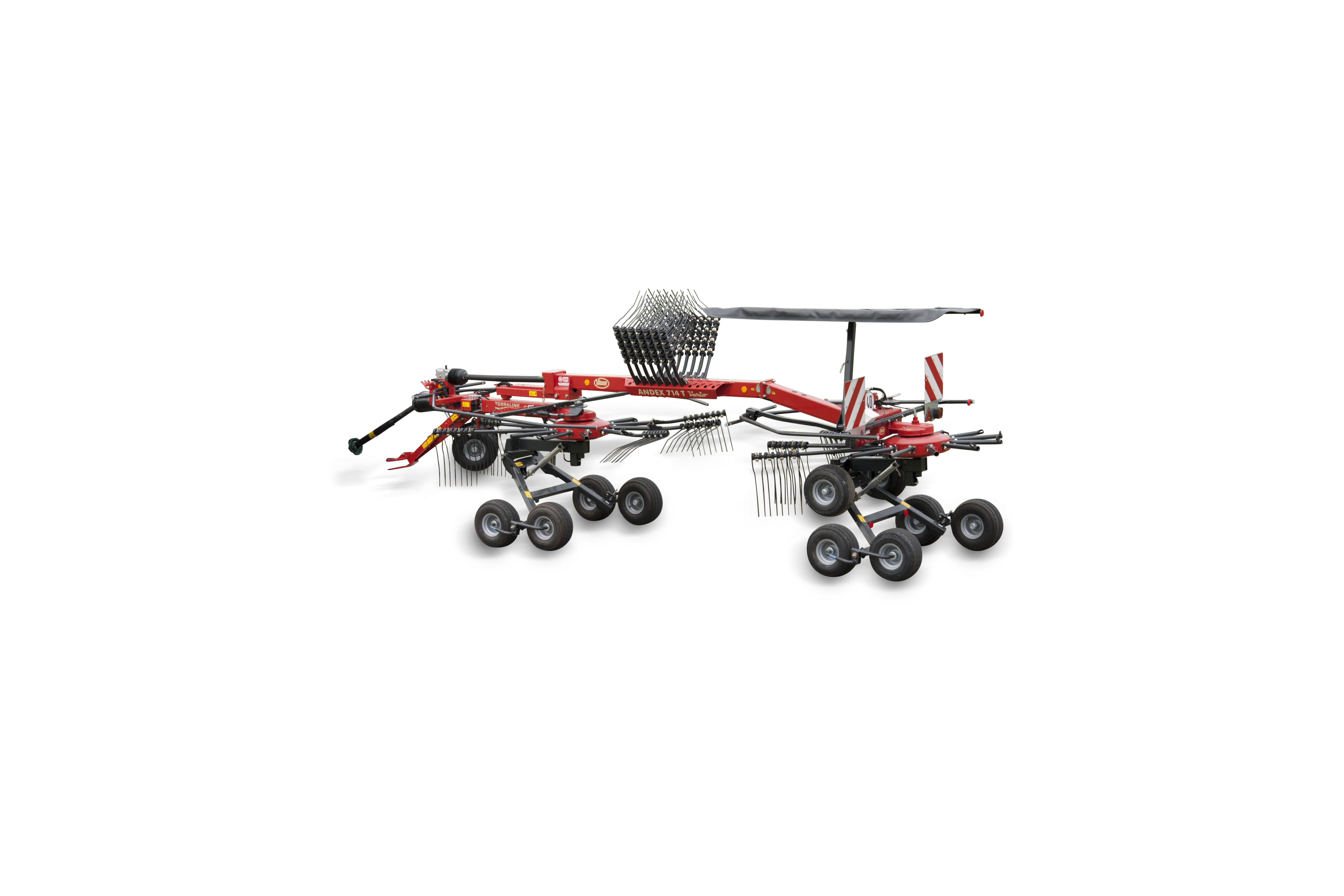 - En standard le Vicon Andex 714T VARIO est équipé du déport latéral, système breveté, du 1er rotor ainsi que la commande électro hydraulique et des 12 bras sur le rotor arrière.